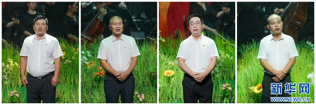 7月17日晚上,來自基層的村干部鞏保雄(左一)、高泉偉(左二)、俞小平(右二)和施金通(右一)走上舞臺,深情講述《新時(shí)代——我做鄉(xiāng)村振興答卷人》。新華網(wǎng) 肖和勇 攝