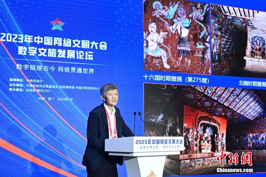 7月19日,2023年中國(guó)網(wǎng)絡(luò)文明大會(huì)數(shù)字文旅發(fā)展論壇在福建省廈門市舉辦。論壇以“數(shù)字鏈接古今 網(wǎng)絡(luò)貫通世界”為主題,邀請(qǐng)國(guó)內(nèi)外數(shù)字化、文博考古、旅游等領(lǐng)域?qū)<液痛砉餐剿鞴偶奈镌跀?shù)字時(shí)代的創(chuàng)造性轉(zhuǎn)化和創(chuàng)新性發(fā)展,以及在數(shù)字技術(shù)賦能下,文旅產(chǎn)業(yè)如何實(shí)現(xiàn)高質(zhì)量發(fā)展。圖為論壇現(xiàn)場(chǎng)。中新社記者 田雨昊 攝
