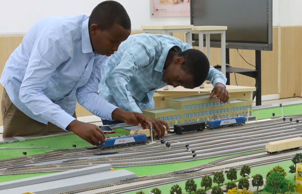 2022年9月19日,在位于吉布提首都吉布提市的工商學(xué)校,學(xué)生在魯班工坊鐵道運(yùn)營沙盤教學(xué)區(qū)學(xué)習(xí)。