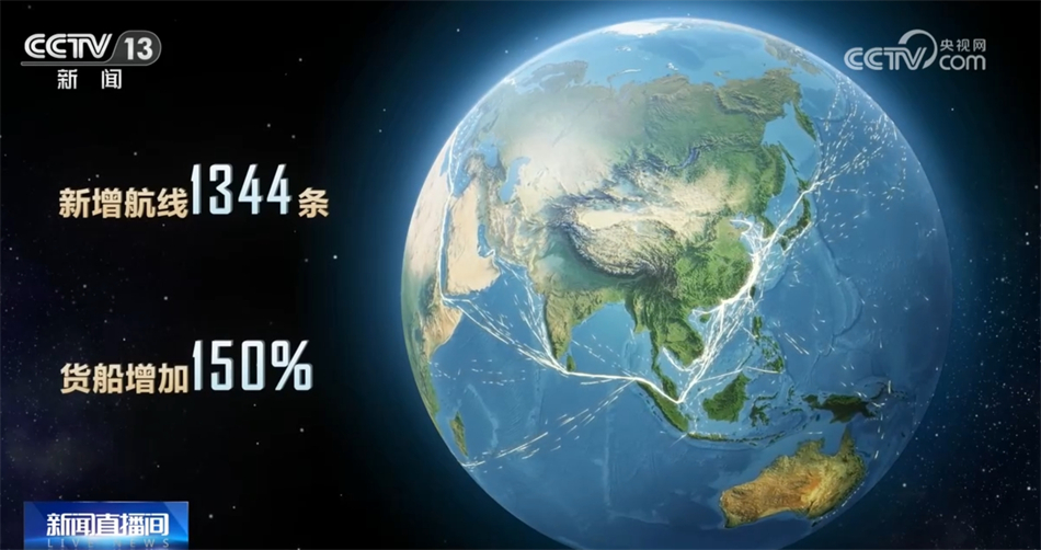向大海,這是2013年時中國與共建“一帶一路”國家間的水運航線。十年間,共建“一帶一路”國家間的水運航線數(shù)量翻了一番,新增航線達到了1344條,穿梭其中的貨船增加150%。“絲路海運”航線已通達全球43個國家的117個港口,織出了一張聯(lián)通世界的貿易流動網(wǎng)絡。